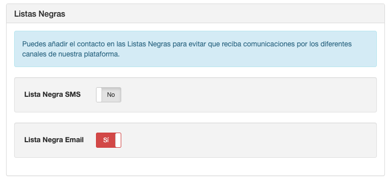 Para realizar una baja manual desde el portal web, debes ir al Listado de contactos de tu cuenta, busca el contacto que quieres asignar a una Lista Negra, activa la opción y guarda los cambios (si no existe, crea un contacto nuevo y asígnale la Lista Negra que elijas).