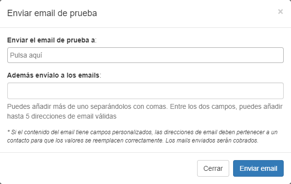 Pulsa sobre el botón 'Enviar email de prueba' y introduce los emails a los que quieres enviar la prueba. Los mensajes enviados serán cobrados.