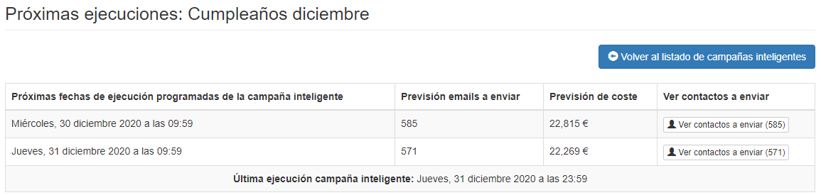 Consulta las próximas ejecuciones de la campaña inteligente para saber la fecha de las próximas ejecuciones, el precio que tendrán y a que contactos se les enviará el Email.