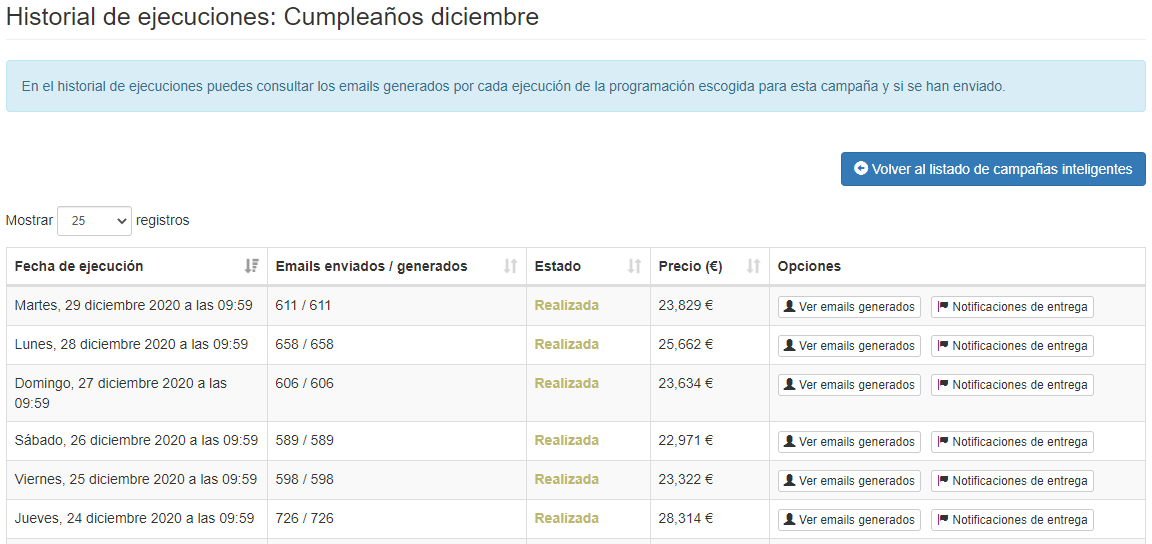 Captura del historial de ejecuciones de una campaña inteligente que felicita a nuestros contactos el día de su cumpleaños