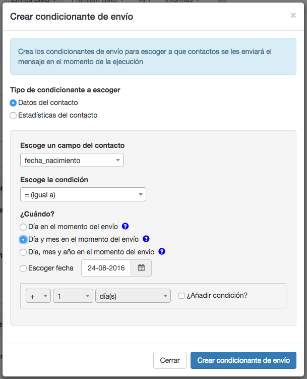 En este caso, estamos creando un condicionante de envío para felicitar a nuestros contactos el mismo día de su cumpleaños. Si quisiéramos avisarle un día antes, añadiríamos la condición de '- 1 día' de la parte inferior.Podemos realizar 4 tipos de comprobaciones