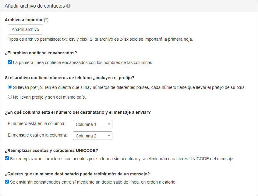 ¡Importante!: Las campañas a través de archivo no aceptan campos personalizados en los mensajes a enviar a cada destinatario.
