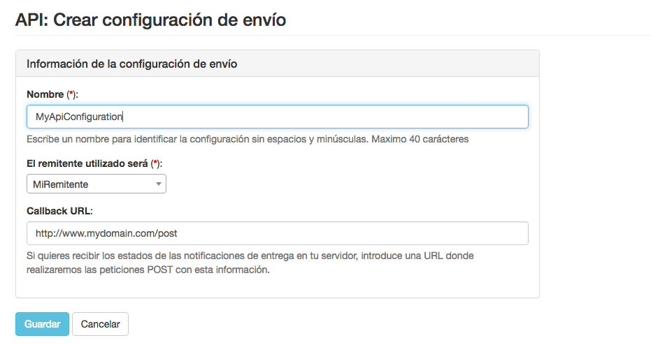 - Escribe un nombre para identificar la configuración sin espacios y minúsculas. Máximo 40 caracteres. Este es el nombre que usarás luego en tus envíos a través de la API.