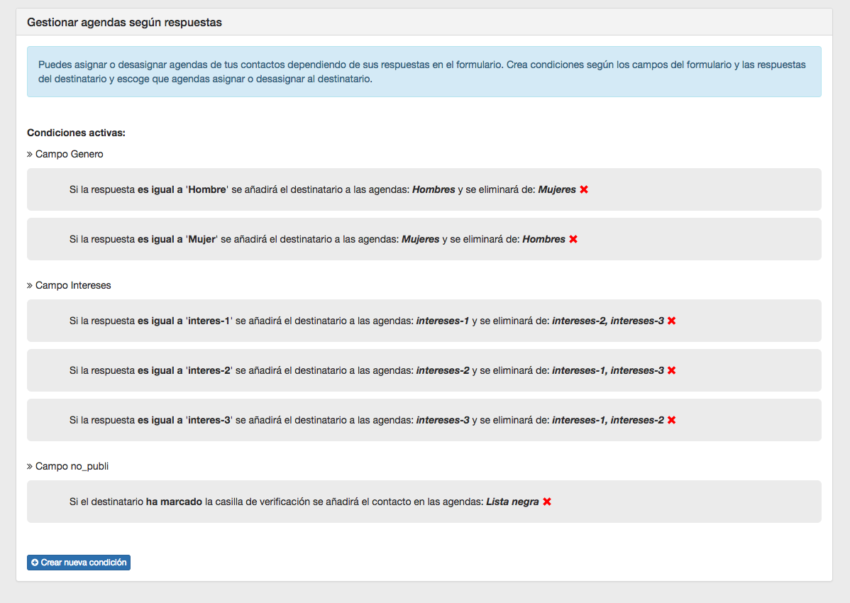 Esta opción te permite crear condiciones según las respuestas de los destinatarios del envío por cada campo de un Formulario. Si la condición se cumple según la respuesta introducida por un destinatario, se le asignarán y/o desasignarán las agendas que escojas para esa condición.