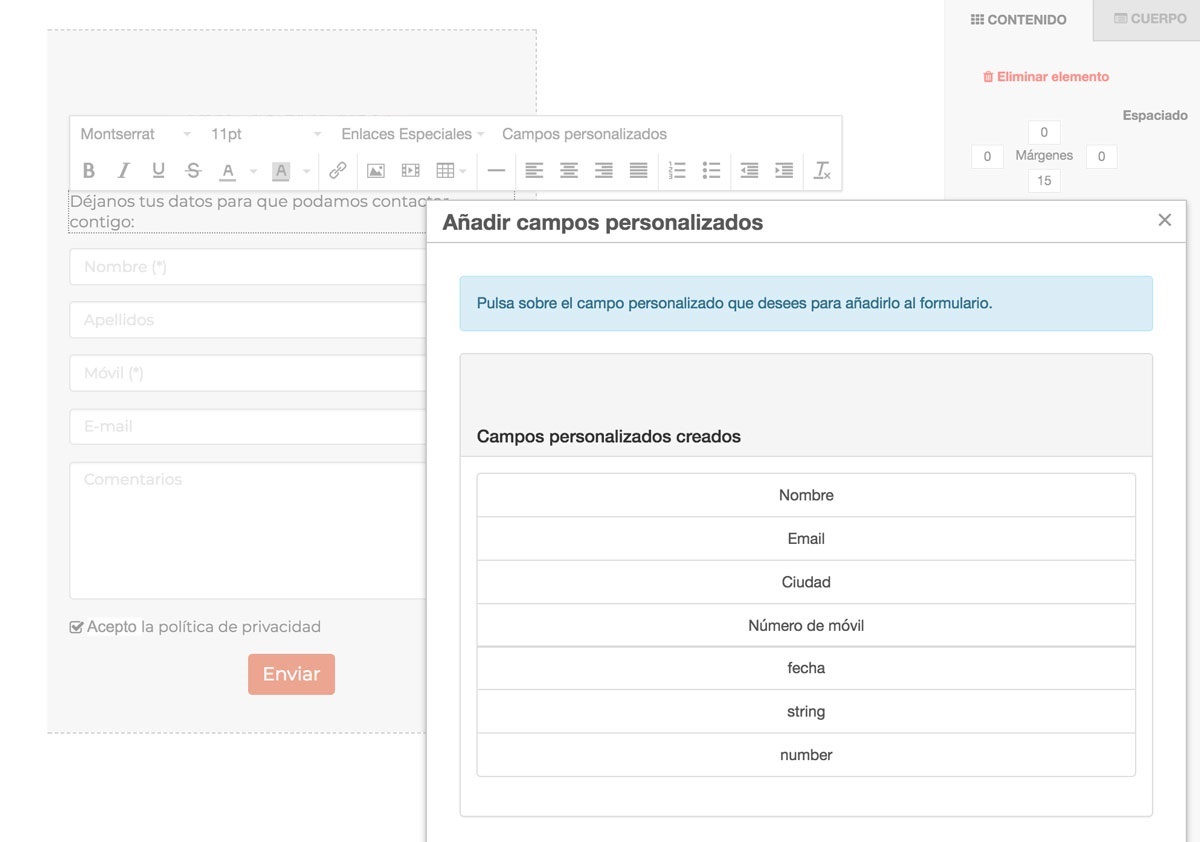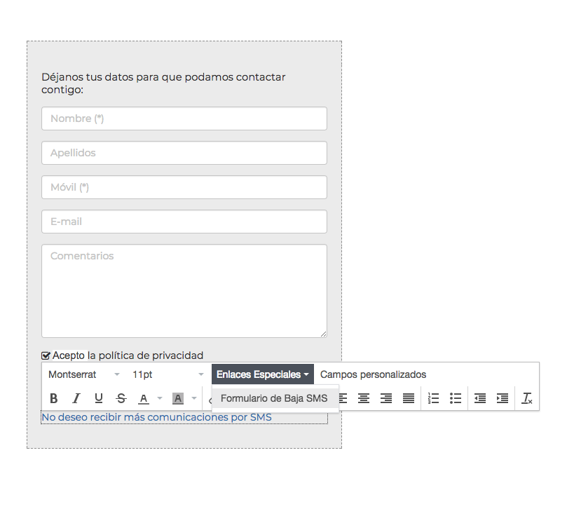 Este elemento también sirve para añadir un un campo personalizado o el enlace de Baja SMS