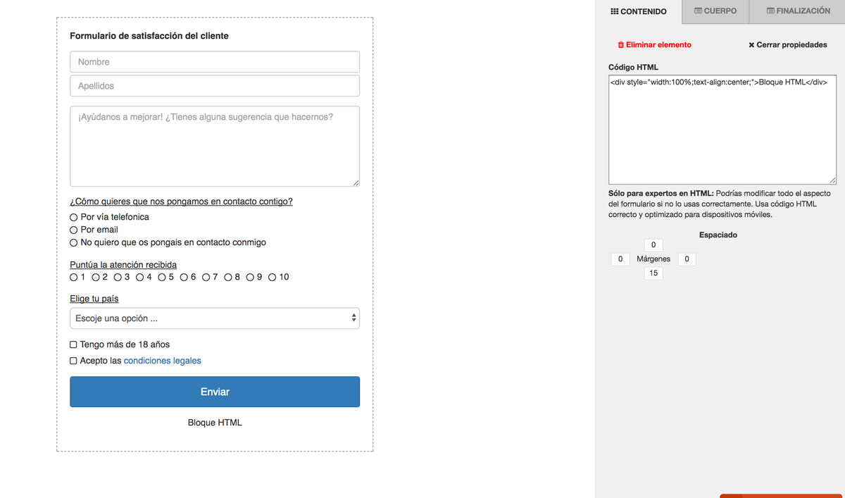 Utiliza el elemento de tipo 'Código HTML' para adjuntar tu propio código en el formulario. No está permitido el uso de scripts. Utiliza este opción solo si conoces HTML, de lo contrario, podrías dañar el diseño y funcionalidad de tu formulario.