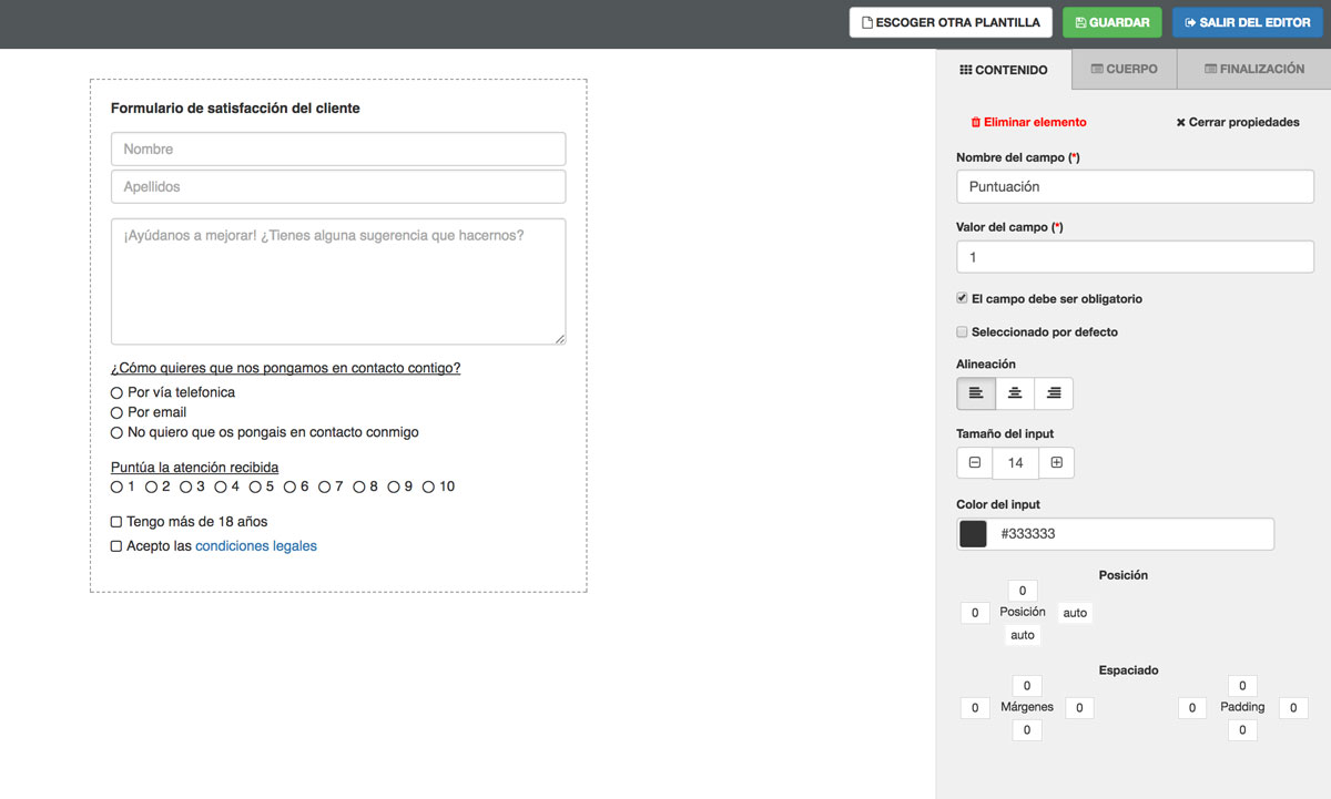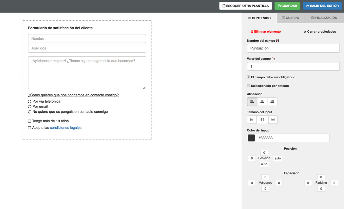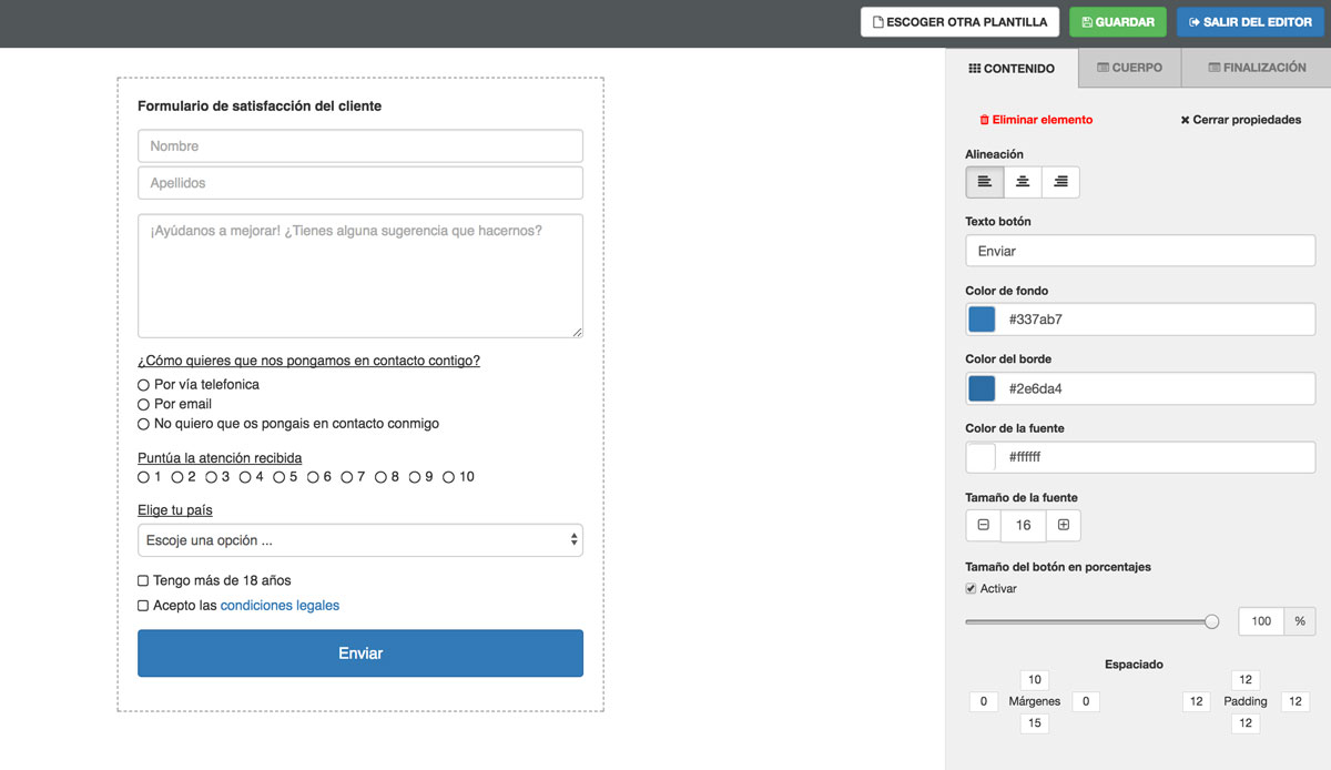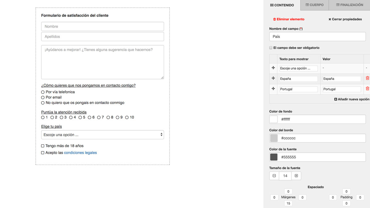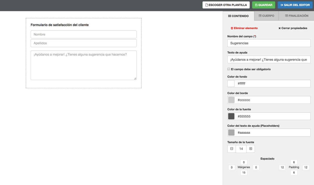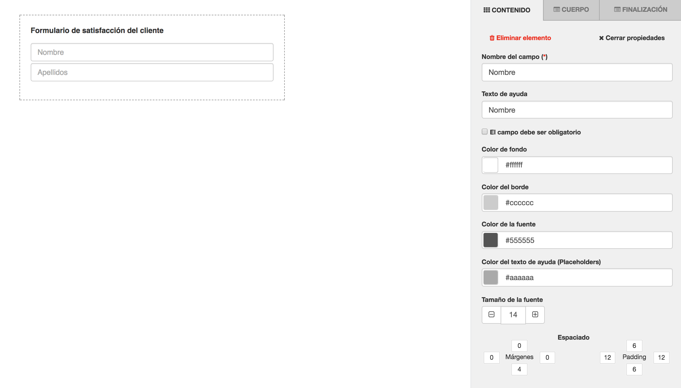 - Desde la pestaña 'Cuerpo' podrás definir el color y la fuente de tu formulario.