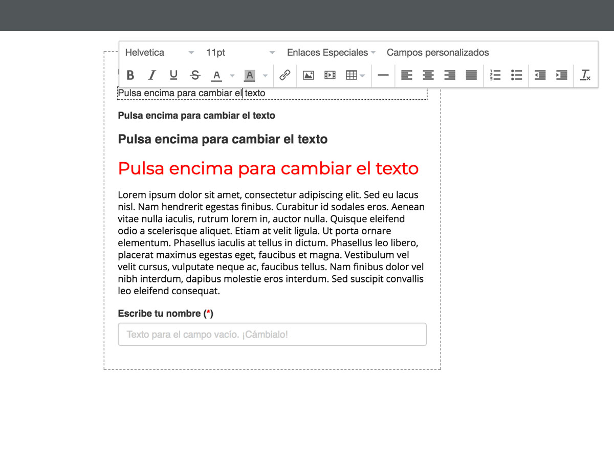 Utiliza este elemento para añadir texto a tus formularios. Lo puedes usar tanto para poner el título de los campos que añadas, como para crear introducciones o párrafos completos.