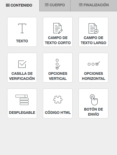 - Desde la pestaña 'Contenido' arrastra elementos para añadirlos a tu formulario. Una vez estén añadidos, puedes cambiar su posición y modificar sus propiedades pulsando encima. Como mínimo deberás asignarle un nombre para poder identificarlo en las “Respuestas del formulario”.