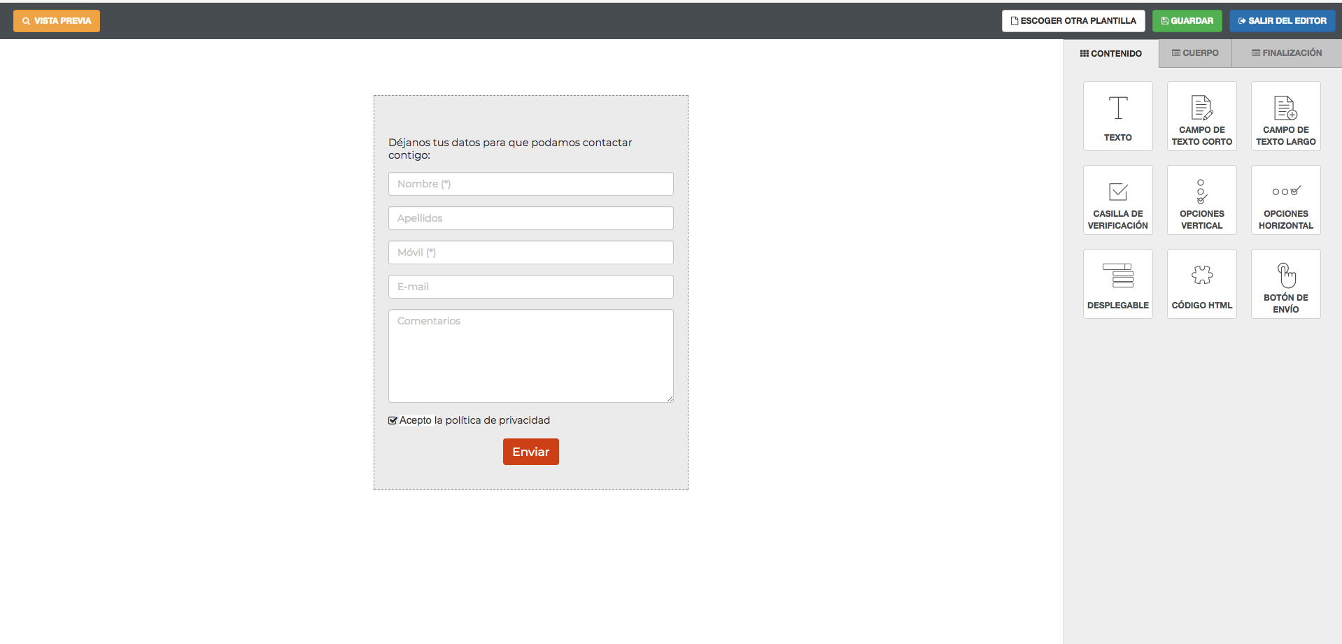 Si deseas crear un Formulario con un diseño espectacular, te recomendamos que crees la estructura básica del formulario desde la herramienta de Formularios y luego desde el apartado de Landings, crees un diseño e incluyas desde ahí tu Formulario.