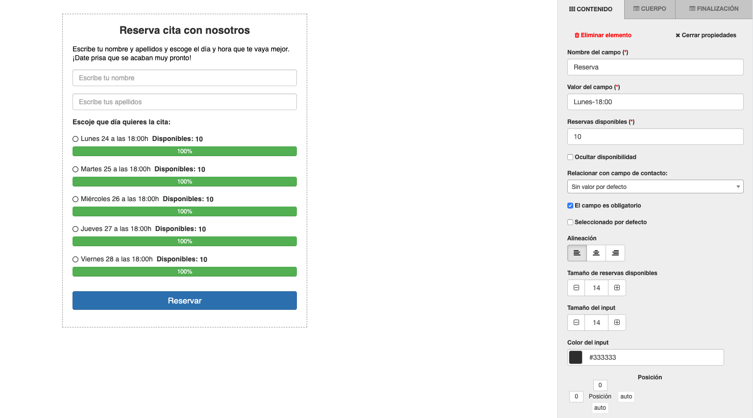 Si quieres asegurarte que sólo puedan enviar el formulario si hay disponibilidad, marca la opción de 'El campo es obligatorio'. Cuando no haya mas elementos disponibles, no se podrá enviar el formulario.
