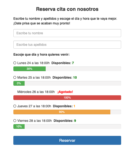 En el formulario que recibirá el usuario, si la disponibilidad de cada opción es inferior al 10% se mostrará en amarillo. Si no hay disponibilidad, se mostrará en rojo. De lo contrario, se mostrará en verde.