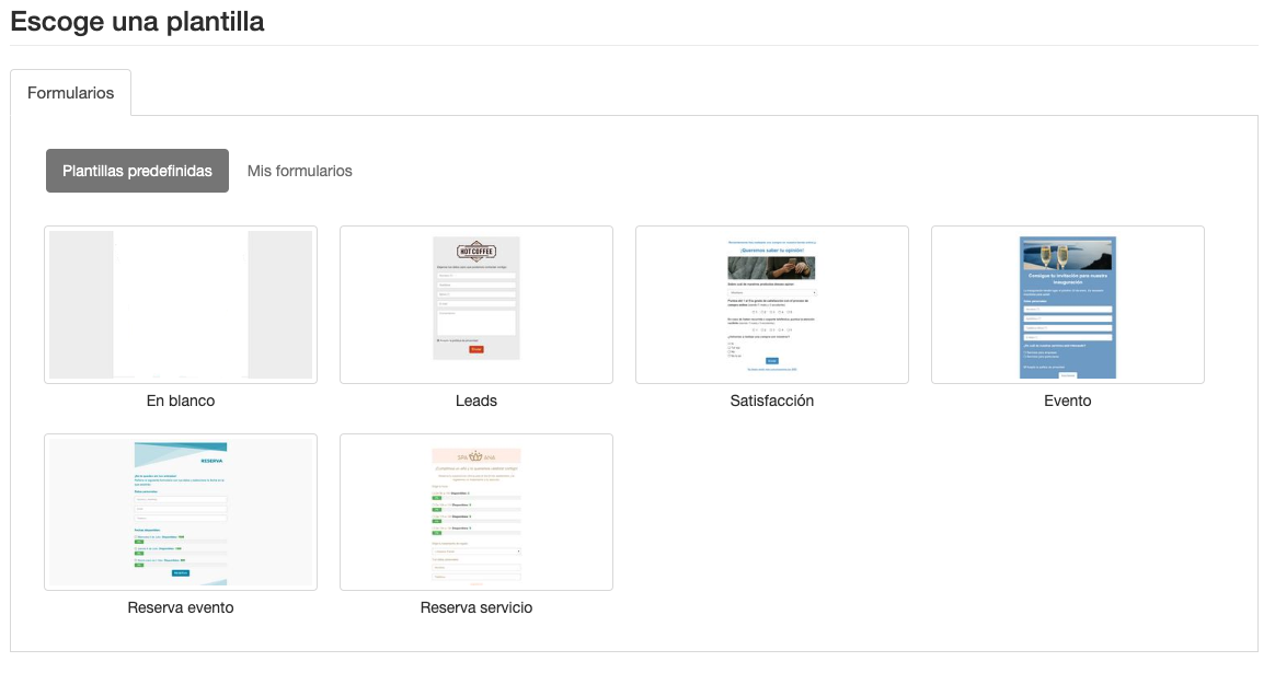 Cuando creas un formulario, tienes la posibilidad de escoger una plantilla en blanco o crear tu formulario a partir de plantillas predefinidas que ponemos a tu disposición. También puedes guardar tus propios formularios como plantillas.