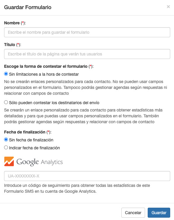 Es una funcionalidad de nuestra plataforma que te permite crear formularios que podrás adjuntar a tus campañas a través de un enlace acortado. Utiliza esta funcionalidad para realizar encuestas, captar leads, crear sorteos y promociones, formularios de inscripción, etc. Podrás ver todas las respuestas recibidas en unas estadísticas detalladas y exportar los resultados.