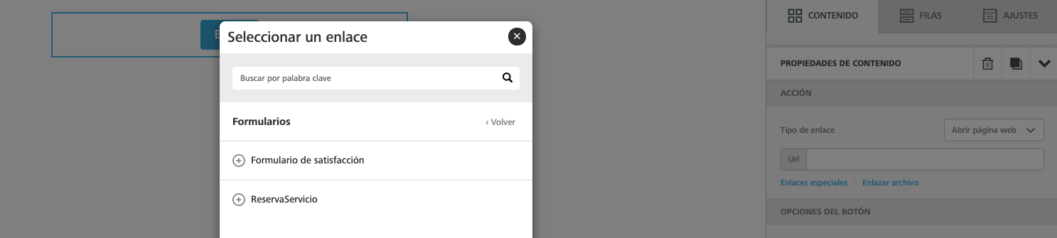 Con un botón: Añade un elemento de tipo botón y en la pestaña Contenido, busca la seccion Acción y pulsa sobre Enlaces especiales. En el modal que se abrirá, elige Formularios y selecciona el que quieras adjuntar.