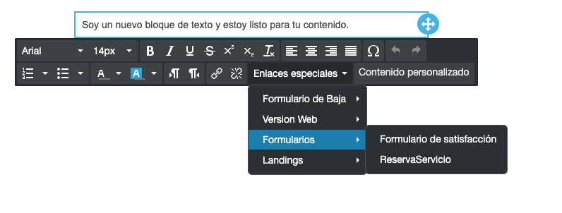 Pulsa sobre el botón de 'Enlaces especiales', y finalmente pulsa en 'Formulario de Baja SMS'. para incluir el enlace en tu formulario